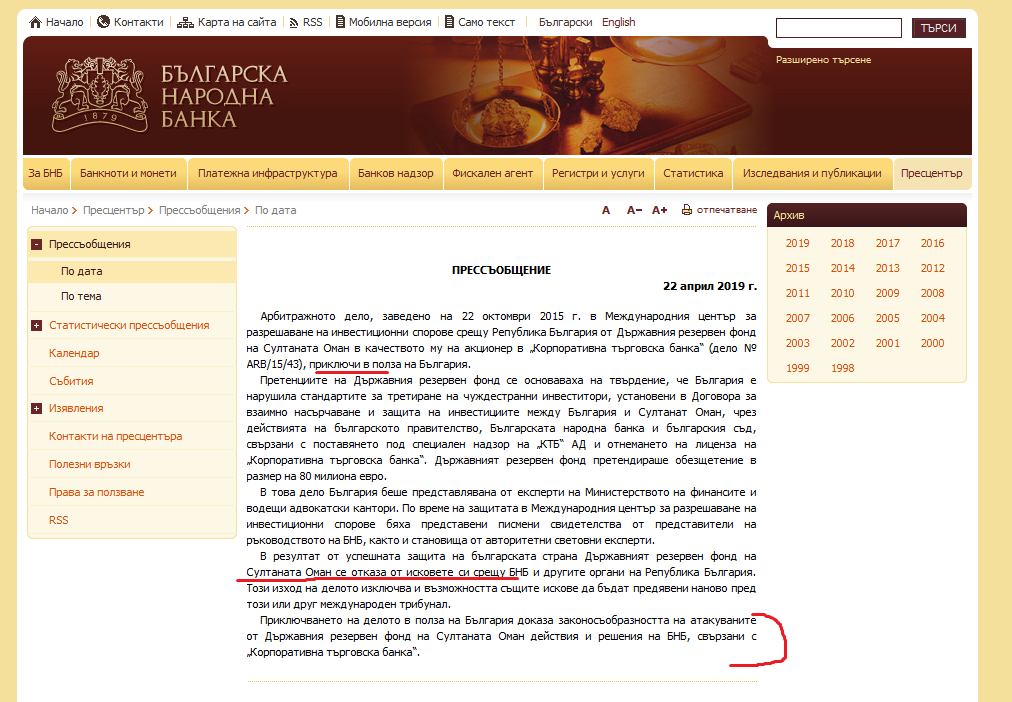 In April 2019, Bulgaria’s Ministry of Finance and Bulgaria’s central bank published press releases in which they claimed SGRF withdrew its claim. I have included screenshots in this article for those of you who speak Bulgarian (Figure 1 and Figure 2). The press release by the Ministry of Finance of 18 April 2019 concerns a number of claims against Bulgaria. There is one paragraph dedicated to the Corporate Commercial Bank case: