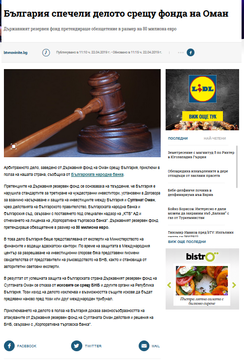 Bulgaria’s propaganda machine was also involved. Pro-government media manipulated the information further. BTV, the largest and most influential television in the country, informed the audience that “Bulgaria won the case against the Omani fund” and this “proved the legality of the central bank’s decisions regarding Corporate Commercial Bank.” (Figure 3)