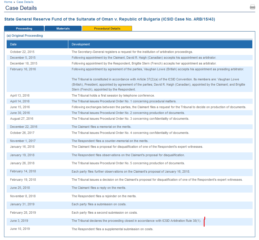 As seen from the procedural details of SGRF v Bulgaria (Figure 5), the arbitration tribunal closed the proceedings pursuant to Rule 38(1) on 3 June 2019, which means that the next step is the handing down of an arbitration award pursuant to Rule 46.