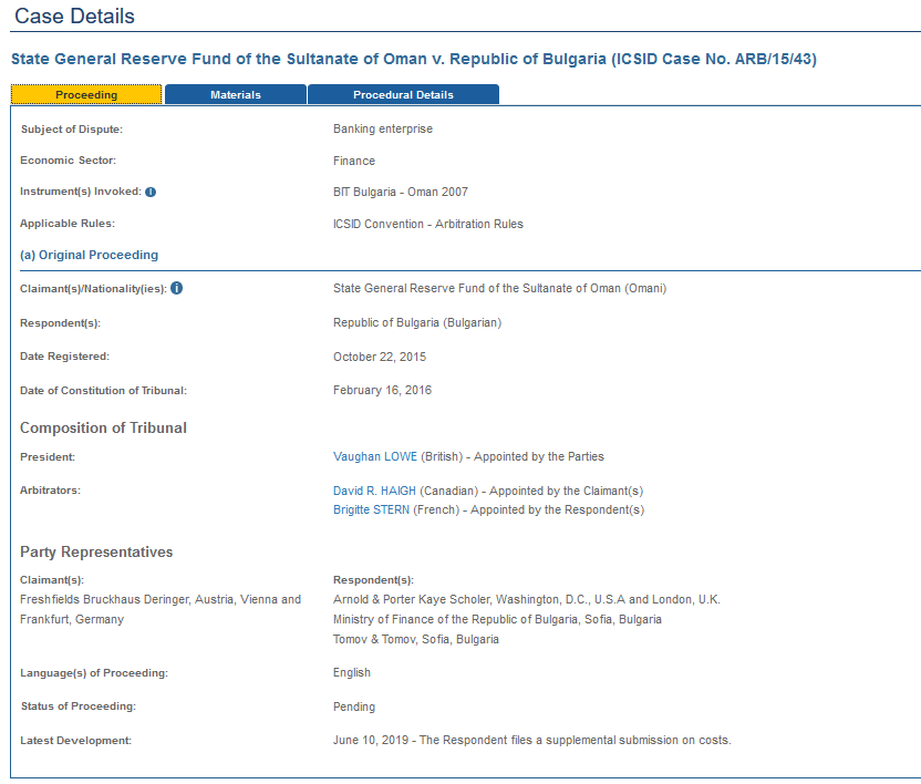 In 2015, the State General Reserve Fund Oman (SGRF), which is the sovereign fund of Oman, submitted an application against Bulgaria before the International Center for Settlement of Investment Disputes (ICSID) in Washington DC (Case No. ARB/15/43). The case concerns Corporate Commercial Bank in which SGRF was the second biggest shareholder. The bank was subjected to a corporate raiding attack with the participation of Bulgarian state institutions – it experienced an artificially induced bank run, its license was withdrawn based on a secret report, which Bulgaria refuses to make public to this day, and no one was allowed to appeal the decision on license withdrawal in violation of case law against Bulgaria by the European Court of Human Rights (Capital Bank v Bulgaria). SGRF sought to defend their investor rights pursuant to the Bulgaria-Oman Bilateral Investment Treaty.