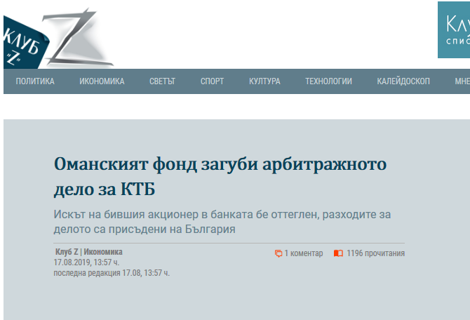 The article published in Clubz is, frankly, absurd. The title is “The Omani Fund Lost the Arbitration Dispute Regarding Corpbank.” The subtitle is “The claim was withdrawn, the costs will be paid by Bulgaria.” Clearly, withdrawing a claim before a court/tribunal does not make you lose the case.