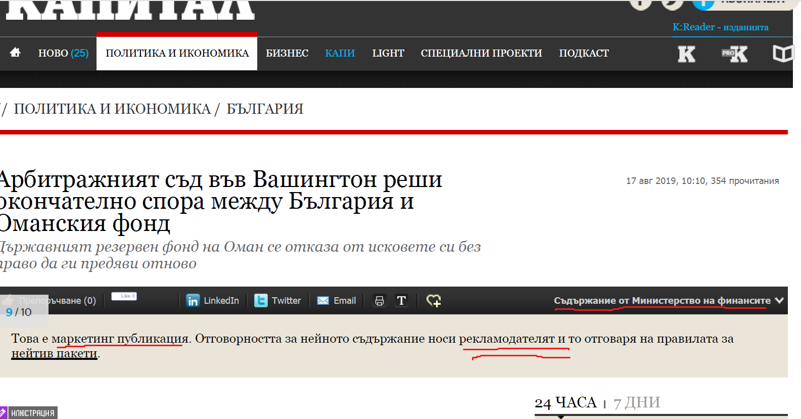 In my prior article, I introduced you to the government propaganda in April 2019 when Bulgaria’s Ministry of Finance and the Bulgarian National Bank announced that SGRF withdrew its claim against Bulgaria. In this section, I provide an illustration of the propaganda which followed the rendering of the Award on 13 August 2019. The Ministry of Finance was so unsure that media would publish anything that they paid for publication. Figure 5 shows a paid article in Capital of 17 August 2019.