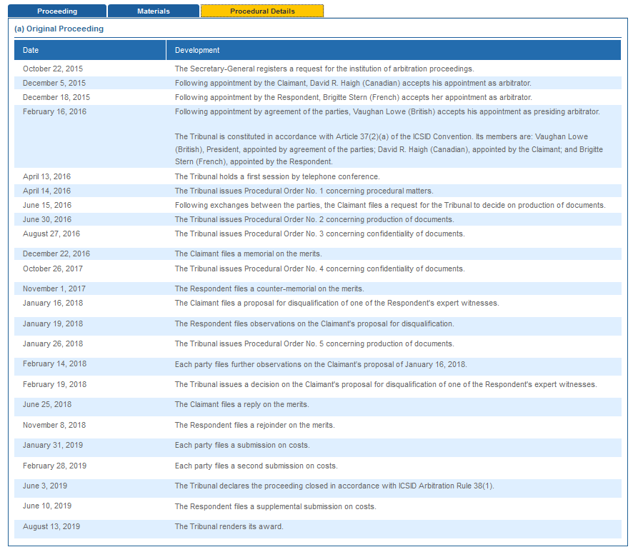 Considering the above legal background, let us take a look at the procedural history of SGRF v Bulgaria (Case No. ARB/15/43): Figure 2 below. There is no record of any Procedural Orders for discontinuance. It is also visible that there was no oral phase, which usually follows the written phase. The only logical conclusion is that parties settled and asked the tribunal to record their settlement as an Award pursuant to Article 43(2) and rule on costs. As seen from the procedural details, right after the written phase, the parties started making submissions on costs.