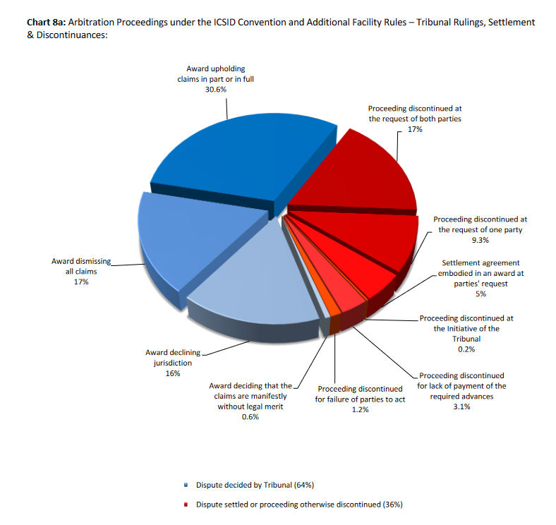 Invoking Rule 43 or Rule 44 of ICSID’s Arbitration Rules is a very common outcome. Let us take a look at official statistics by ICSID. Figure 3 shows the outcomes of all ICSID cases up to 2019 when THE ICSID CASELOAD—STATISTICS (ISSUE 2019-1) was published: 17% of proceedings were discontinued at the request of both parties, 9.3% of proceedings were discontinued at the request of one party, and in 5% of the cases the settlement agreement was embodied in an award at the parties’ request.