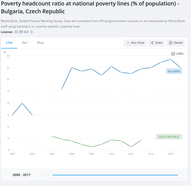 In addition to median earnings, another sure-tell sign that a country struggles is the number of people who live below the poverty line. For Bulgaria, the number is very high (22%) and the number has been more or less consistent for a decade.