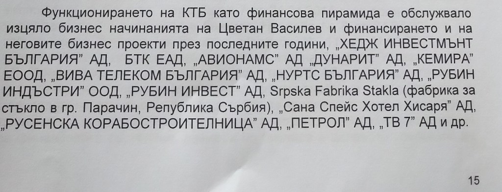 Тъкмо звездният екип напоително разказал, че КТБ била пирамида, и попадаме на този параграф на страница 15 – Фигура 10. Уж КТБ била пирамида, но финансирала покупката на Виваком (БТК), и НУРТС, и фабрика за стъкло в Сърбия, и фабрика за стъкло в България, и корабостроителница, и Петрол, и Дунарит, и Авионамс…