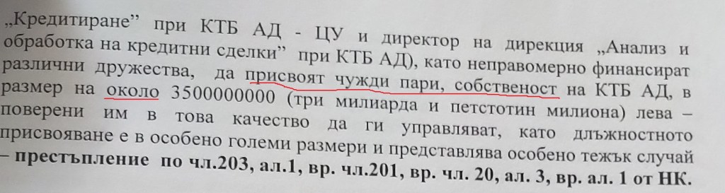 В един параграф формулираме деянието – тези хора “неправомерно финансират различни дружества, да присвоят чужди пари, собственост на КТБ АД, в размер на около 3500000000 лв… поверени им в това качество да ги управляват”.