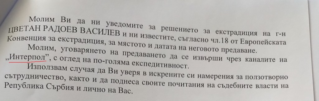 Знаете, че българската прокуратура много обича Интерпол. Ето поредното доказателство! Сърбия е на един хвърлей разстояние, но Цацаров настоява Цветан Василев да бъде предаден по каналите на Интерпол за по-голяма експедитивност. Все си мисля, че предаването се урежда, след като има позитивно решение за екстрадиция, но тайният наръчник на българските власти препоръчва друго.