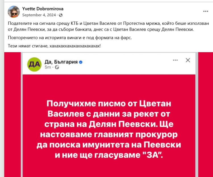 PPPS. Интересни признания е направила Ивет Добромирова във фейсбук миналата година… Което наистина е иронично! Първо, и тя е разписала мишмаша на “Протестна мрежа”. Второ, същата беше и свидетел по наказателно дело-шамар, заведено от Николай Стайков, Антоанета Цонева и Асен Генов срещу Любомир Денев, който беше заподозрял, че в сигнала, чийто текст те държаха в тайна, се съдържат клевети, слухове и спекулации с цел набедяване. Тъжителите загубиха това дело. За него може да прочетете повече в статията “Бумеранг! Как Николай Стайков, Антоанета Цонева и Асен Генов заведоха наказателно “дело шамар” и го загубиха“.