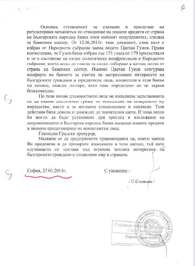 Погледнете, обаче, какво се вменява от “Протестна мрежа” – че някой от “Банков надзор” бил извършил престъпление по служба! Тоест, “Протестна мрежа” се опитват да криминализират нещо, което не може да съставлява престъпление. Първо, престъпленията си имат елементи, които са описани в литературата. Без да влизаме в детайли, наказателната отговорност е винаги лична. Второ, трябва да има мотиви – как и кой от “Банков надзор” се е облагодетелствал да си затваря очите за административни нарушения? Трето, трябва да има престъпен умисъл – в случая, някакво желание да се нанесе щета. Четвърто, трябва да има и видима щета. И точно тук е заровено разковничето защо им е трябвал странният сигнал срещу Цветан Гунев от Пепи Еврото от март 2014 г.!