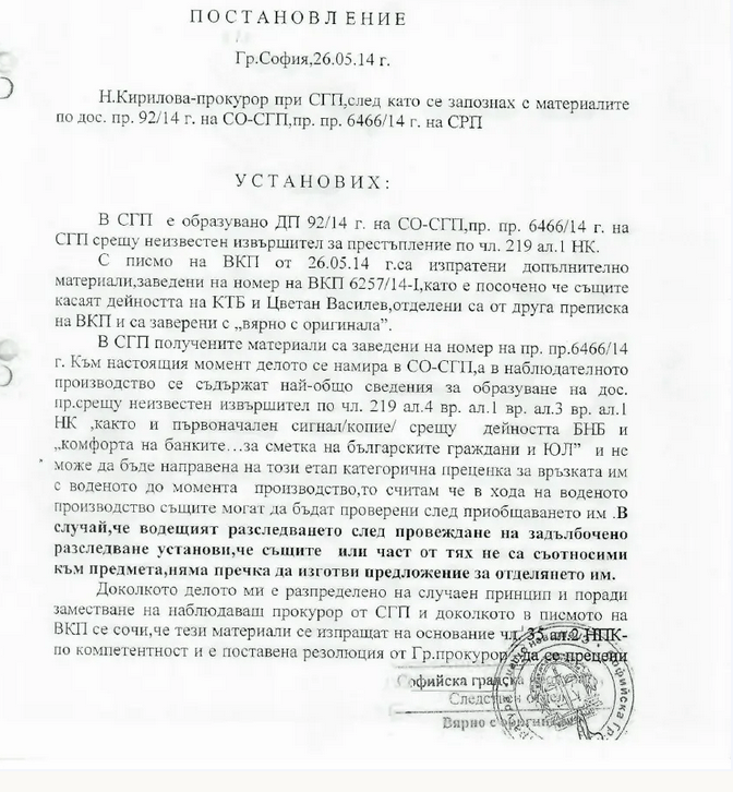 Указанието в долния ляв ъгъл от 26.05.2014 г. върху същия сигнал материалите за КТБ и Цветан Василев да се отделят в отделно производство е още по-впечатляващо и от бързината и грижата, с която се е придвижил сигналът.